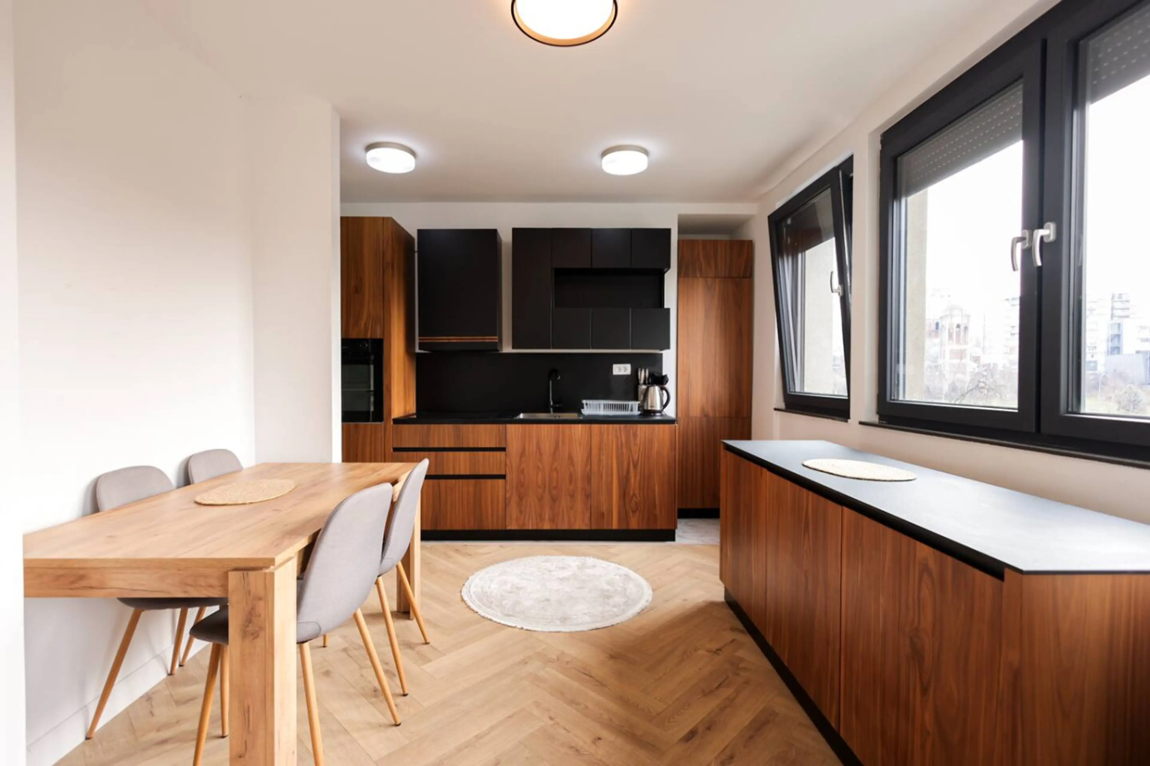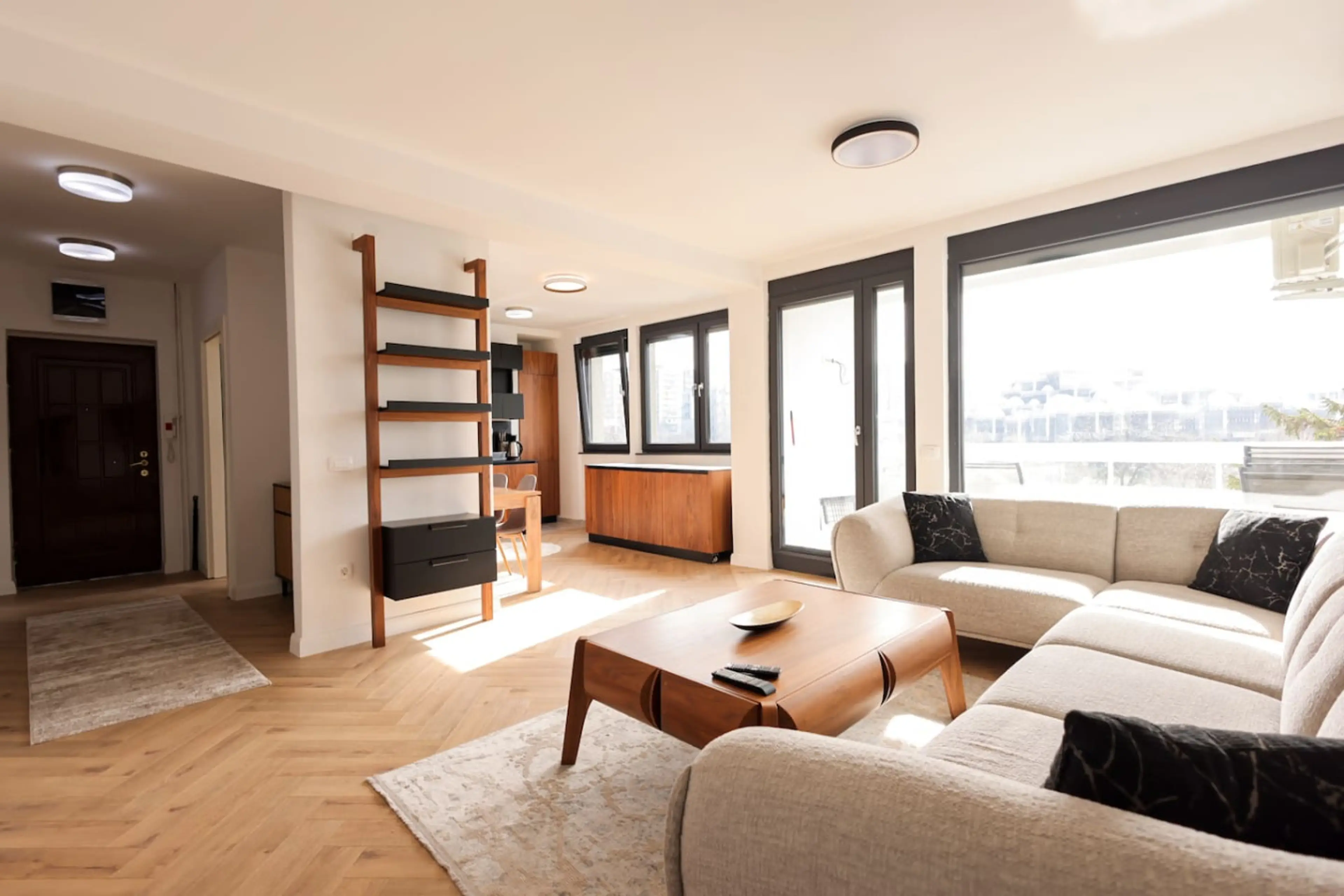 This bright, modern apartment offers a warm and inviting atmosphere with its clean design and natural light throughout. The cozy bedroom features a minimalist wooden bed and soft tones for relaxation. A spacious living area includes a comfortable sectional sofa and stylish decor, perfect for unwindi...